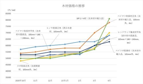 木材が供給不足に陥り、価格が高騰する“ウッドショック”に住宅業界が震撼(しんかん)している。2021年3月ごろに影響が顕在化し、その後は悪化の一途をたどる。日刊木材新聞社の調査によると、ベイマツ乾燥材正角の4月の販売店価格は7万8000円/m3で、半年間…